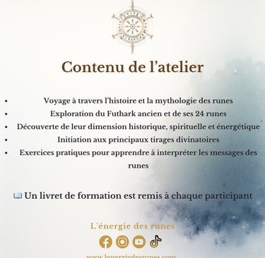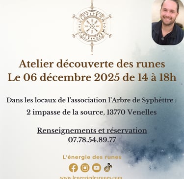 Que vous soyez attiré par les runes pour la première fois, ou que vous ressentiez l’envie d’approfondir ce lien, cet atelier est l’occasion idéale de faire un pas de plus dans leur univers.